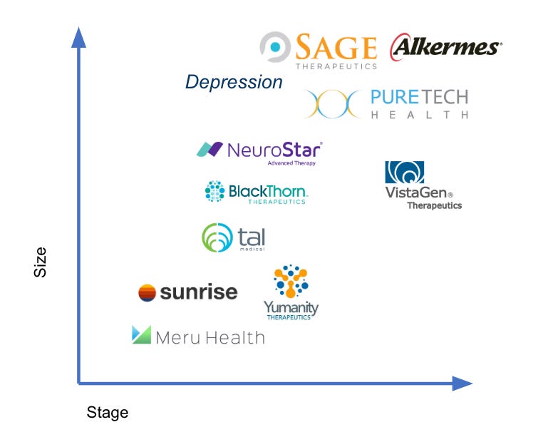 To make a dent in depression, better diagnosis and treatments need to emerge. The payment side is a little trickier and might be pushed a bit by the technology and more-and-more awareness. Say for cancer, the diseases can be effectively treated with an antibody or cell therapy. Cancers and their mechanisms are pretty well understood. Depression is not. It’s a complex phenotype seemingly with a lot of variation. As a result, both molecular and digital therapeutics might have equal chances are improving the lives of depression patients. In addition, new biomarkers to treat depression would be useful. Also, medical devices and prosthetics could also play a role to treat depression.